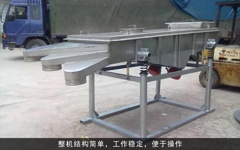 单层直线筛采为双振动电机驱动,当物料从给料机均匀地进入筛分机的进料口时,两台电机通过同步、反向旋转时所产生的激振力在平行于电机轴线的方向相互抵消,在垂直于电机轴的方向叠为一合力,在激振力和物料自重力的共同作用下,使物料在筛面上被抛起向前作直线运动,物料通过多层筛网产生数种规格的筛上物、筛下物,然后又分别从各自的出口排出,从而达到筛分的目的。